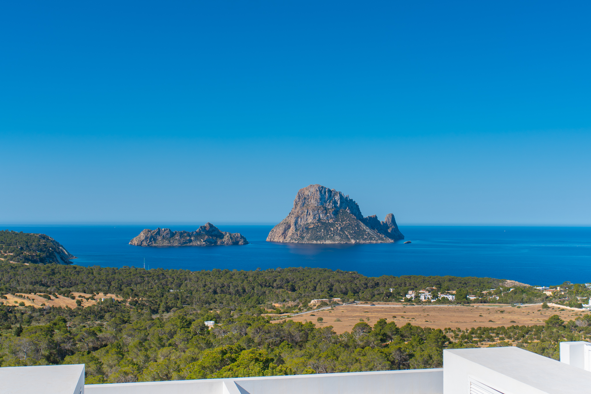 Set on a prime plot in Cala Carbó, the villa features a large infinity pool, sun terraces, and shaded lounge areas, all with panoramic views of Es Vedrà and the Mediterranean. The outdoor spaces are designed for relaxation and entertaining, with complete privacy, an outdoor shower, and two private parking spaces.